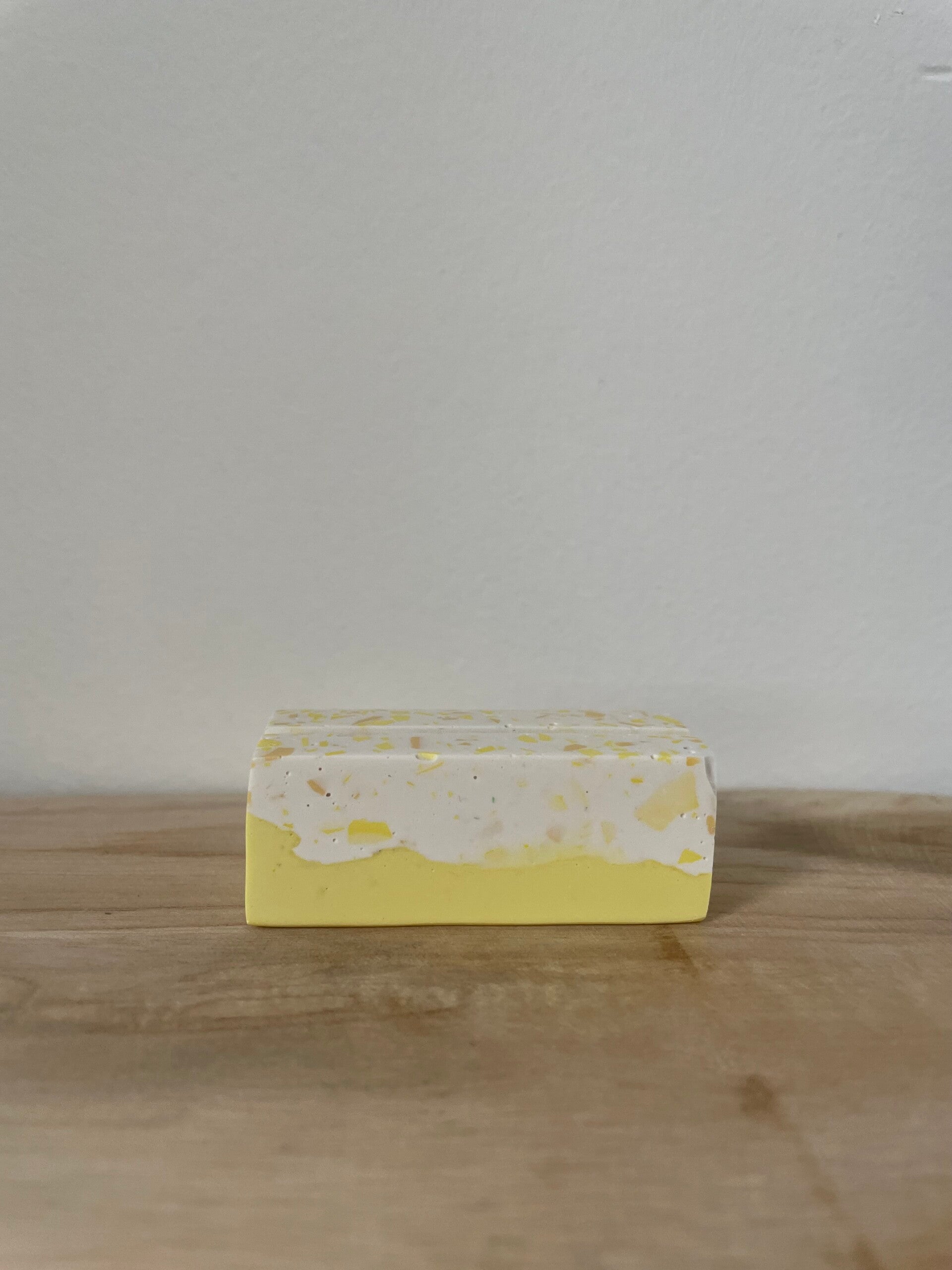 Kies je voor een combinatieafwerking, dan is bijvoorbeeld de basiskleur wit, met giraffe terrazo. Het effen kleur onderaan is dan een kleur dat terugkomt in de terrazzo afwerking, in dit voorbeeld geel.